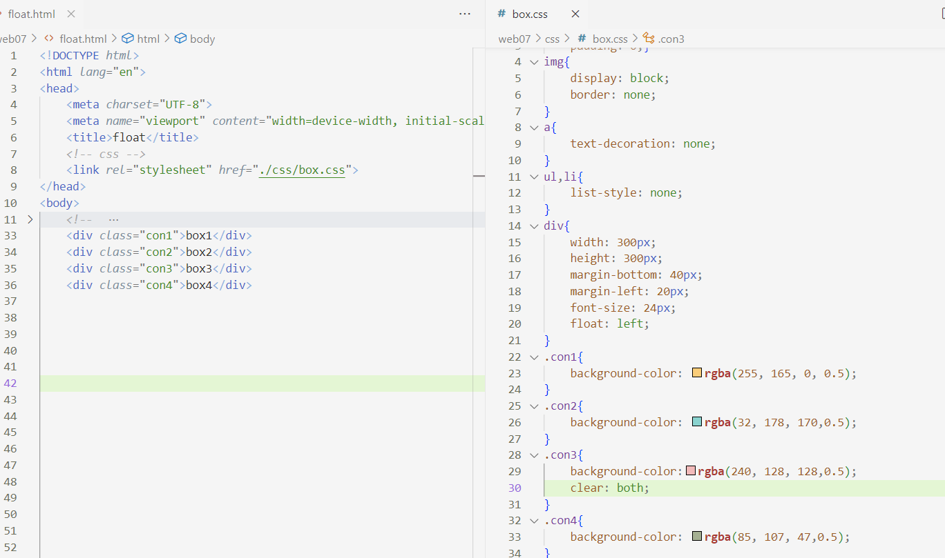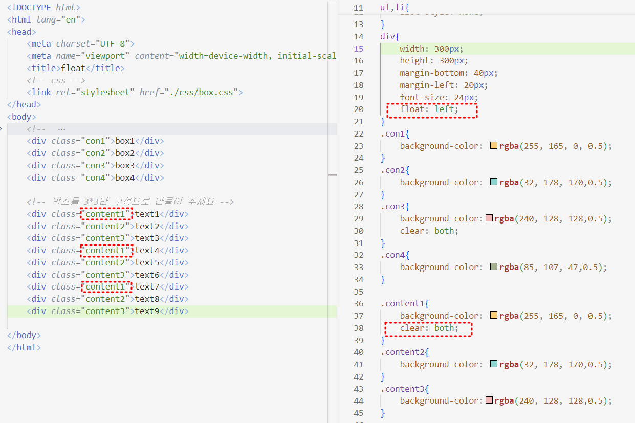 아래에 있는 박스들은 빈 공간을 채우기 위해 위로 치고올라오는 현상이 생기는데, 이 현상을 막고 박스를 위에서 아래로 배치하려면 clear속성을 이용한다.