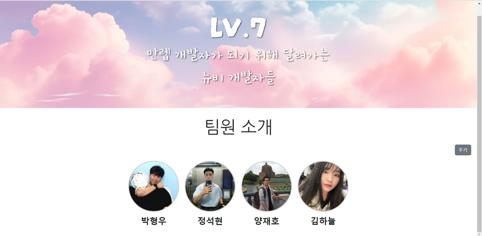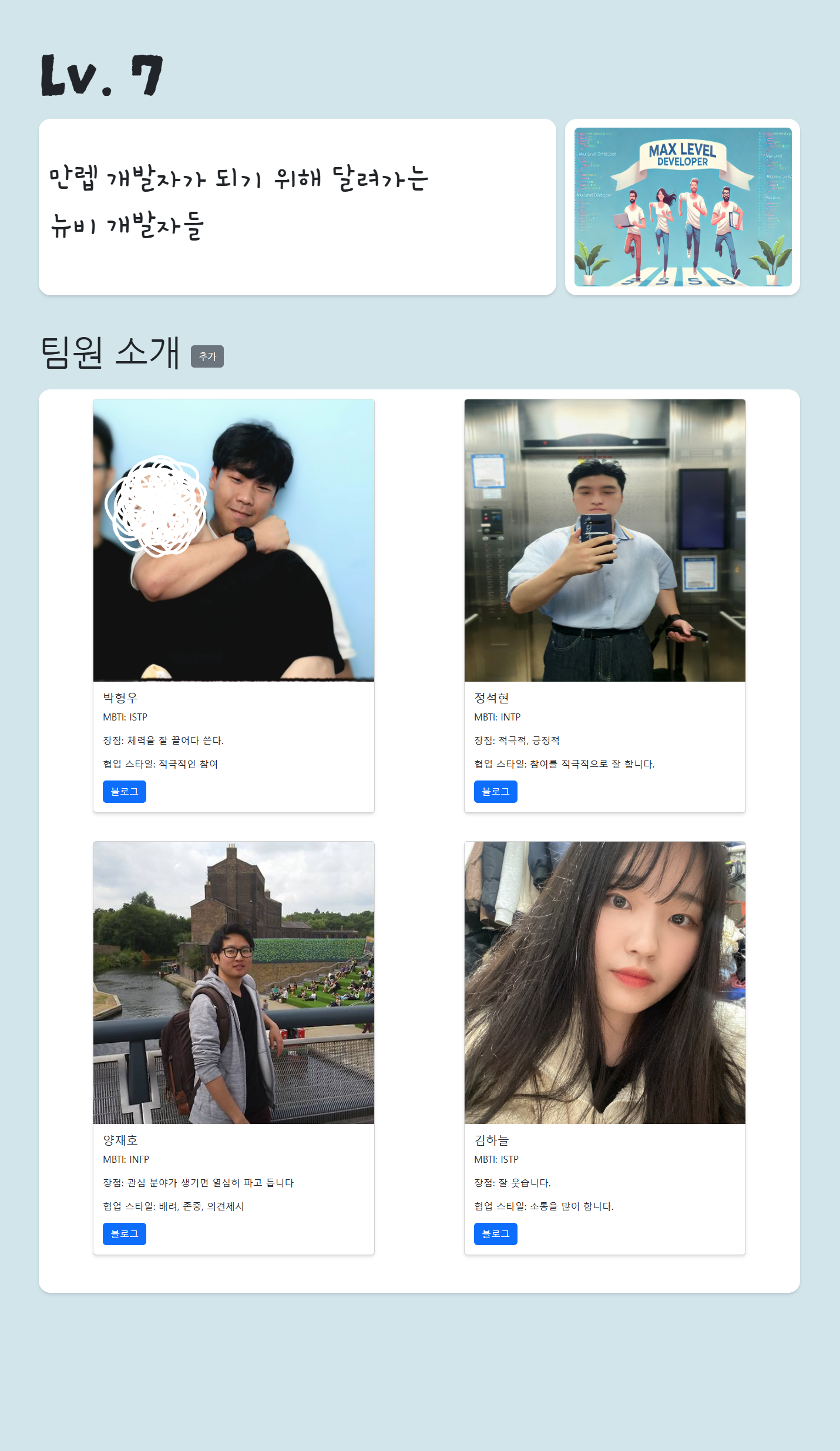중간에 팀을 바꾸면서 하루 늦게 합류하게 되어 걱정이 많았지만, 팀원분들이 환영해 주시고 잘 챙겨주셔서 큰 부담 없이 적응할 수 있었습니다. 덕분에 편안한 분위기에서 팀 프로젝트를 진행할 수 있었고, 짧은 기간이지만 함께 협력하며 많은 것을 배우고 도움을 받을 수 있었습니다. 다른팀으로 가셔도 다들 화이팅 하세용!