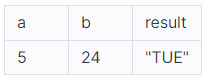 2016년 1월 1일은 금요일입니다. 2016년 a월 b일은 무슨 요일일까요? 두 수 a ,b를 입력받아 2016년 a월 b일이 무슨 요일인지 리턴하는 함수, solution을 완성하세요. 요일의 이름은 일요일부터 토요일까지 각각 SUN,MON,TUE,WED,THU,FRI,SAT 입니다. 예를 들어 a=5, b=24라면 5월 24일은 화요일이므로 문자열 "TUE"를 반환하세요.