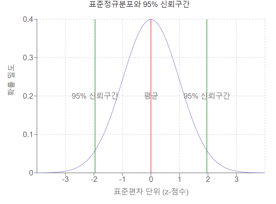 - 1.96은 표준정규분포에서 95% 신뢰수준에 해당하는 z-score입니다.