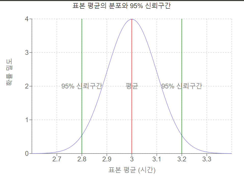 - 95% 신뢰구간: 3 ± (2 × 0.1) = 2.8시간에서 3.2시간