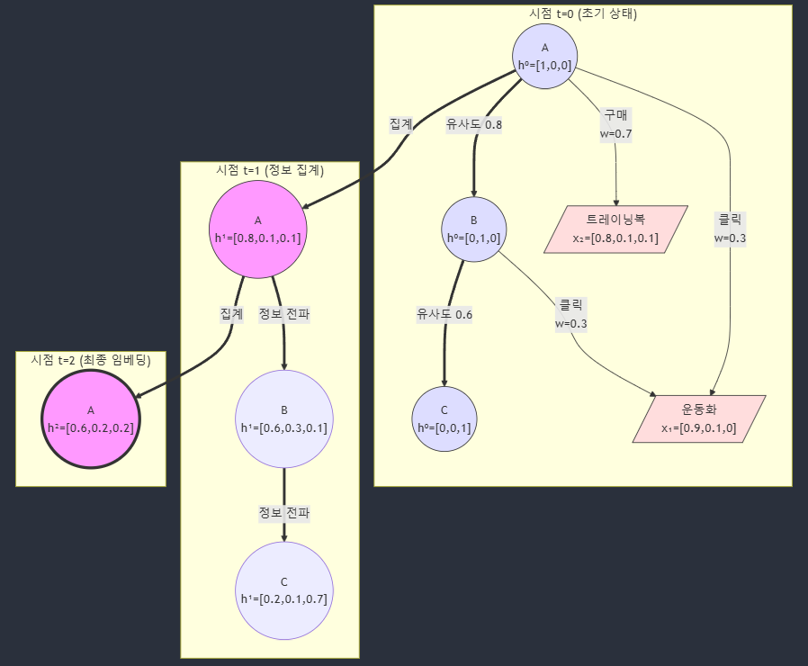사용자 A: h⁰ₐ = [1,0,0] // 운동 선호