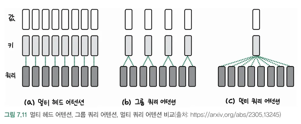 그룹 쿼리 어텐션은 특히 긴 시퀀스를 처리할 때 효율적이며, transformer 모델의 성능을 유지하면서도 계산 비용을 크게 줄일 수 있는 장점이 있습니다. multi-head attention의 변형으로서, 실제 적용 시에는 모델의 크기와 태스크의 특성에 따라 적절한 쿼리 수를 선택하는 것이 중요합니다.