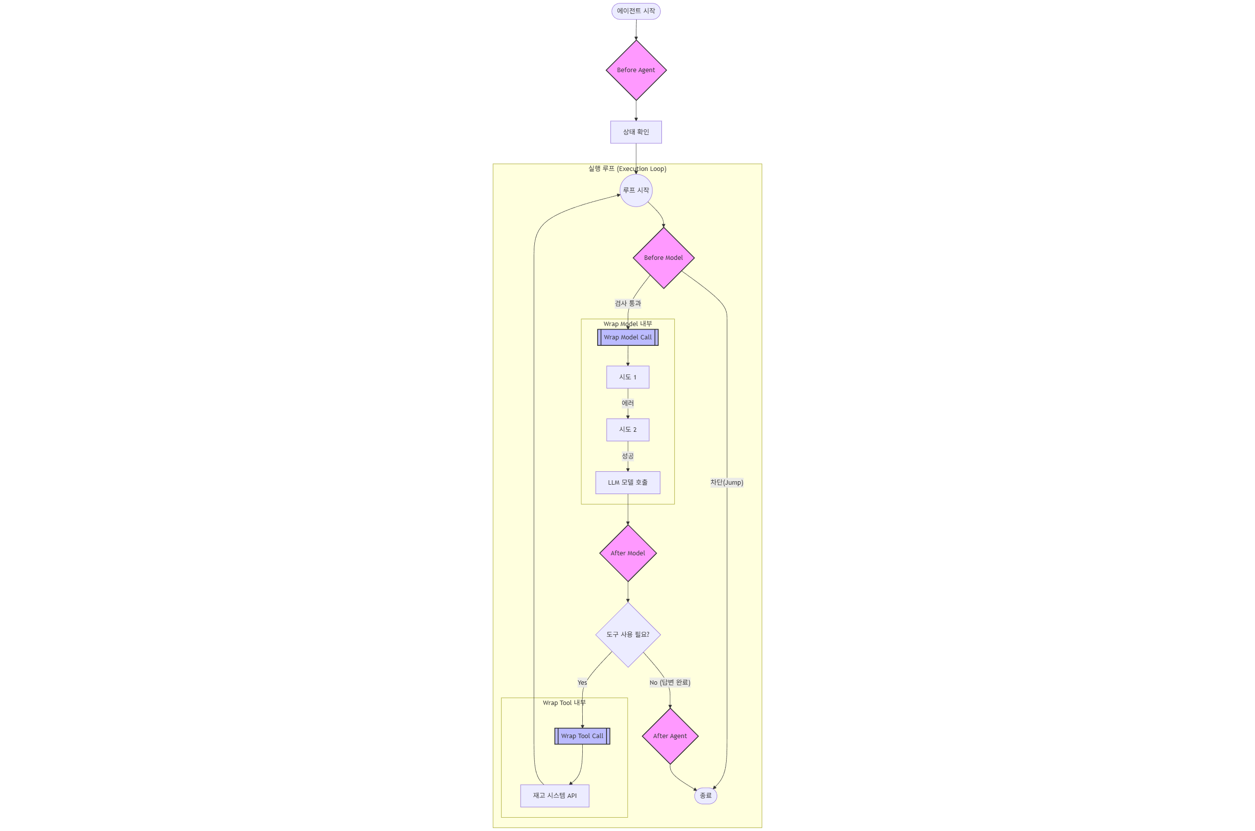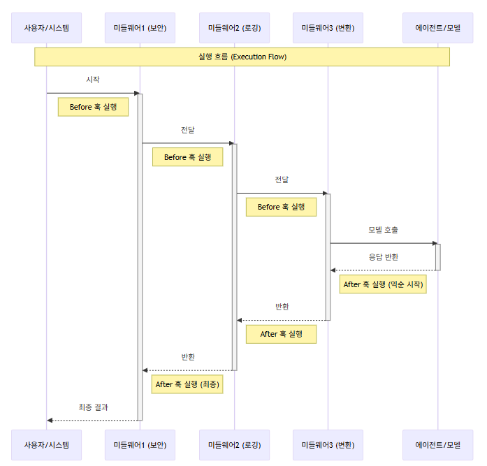미들웨어는 에이전트가 생각하고 행동하는 흐름(Flow) 중간에 개입하는 코드입니다.