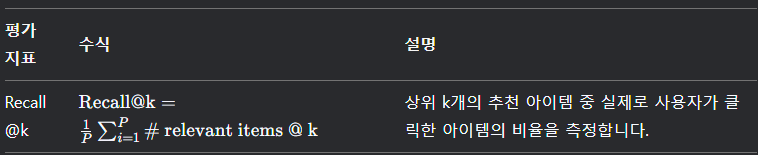 모델의 성능을 평가하기 위해 오프라인 평가를 수행합니다. 주요 평가 지표로는 Recall@k를 사용합니다.