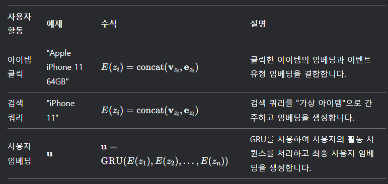 사용자 임베딩은 사용자의 온사이트 활동(아이템 클릭, 검색 쿼리 등)을 기반으로 생성됩니다. 이는 사용자의 다양한 활동을 다중 모달로 통합하여 개인화된 추천을 가능하게 합니다.