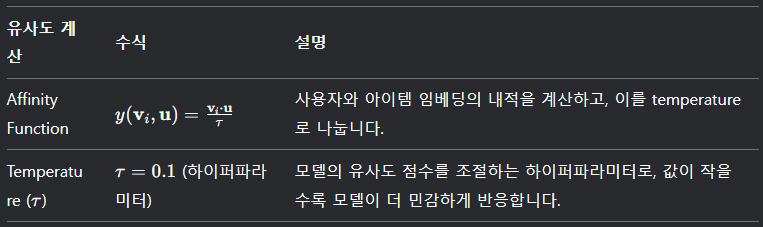 사용자와 아이템 간의 유사도를 계산하기 위해 Affinity Function을 사용합니다. 이 함수는 사용자 임베딩과 아이템 임베딩의 내적을 기반으로 합니다.