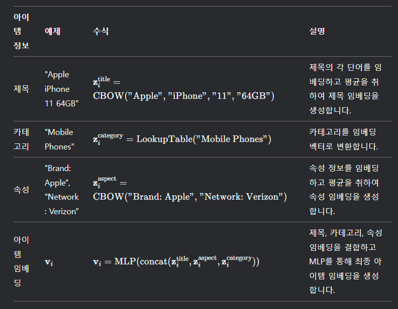 아이템 임베딩은 아이템의 콘텐츠 정보(제목, 카테고리, 속성 등)를 기반으로 생성됩니다. 이는 콜드 스타트 문제를 해결하기 위해 아이템의 고유 ID 대신 콘텐츠 정보를 사용합니다.