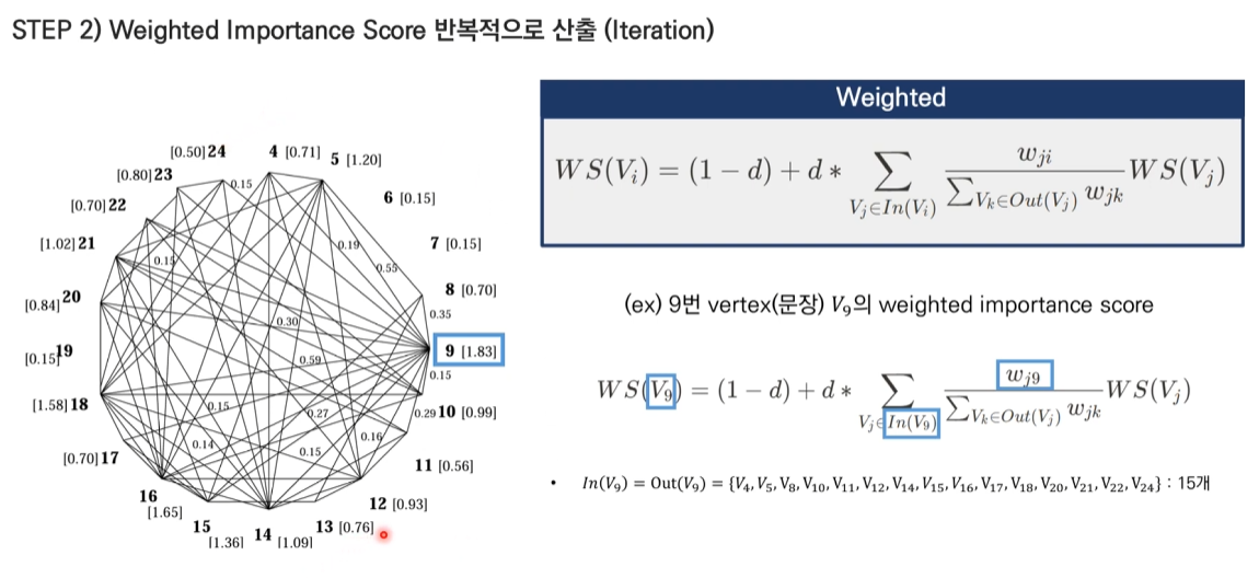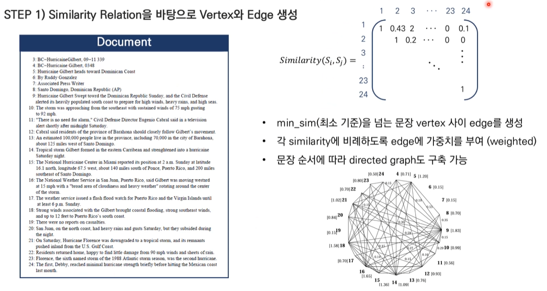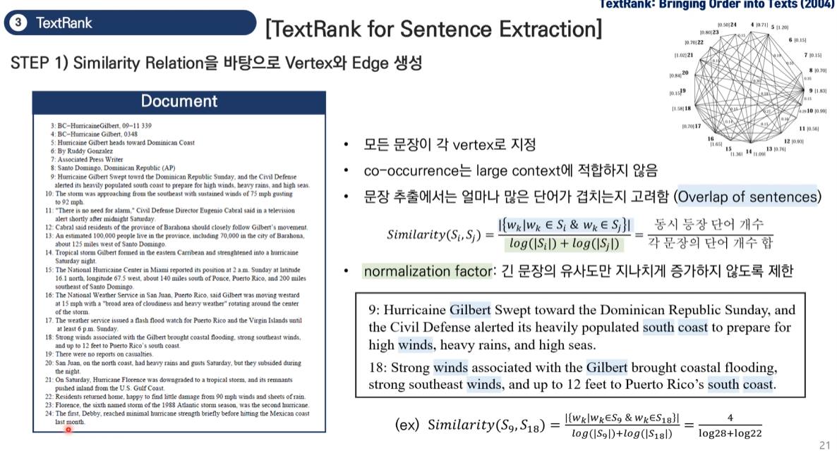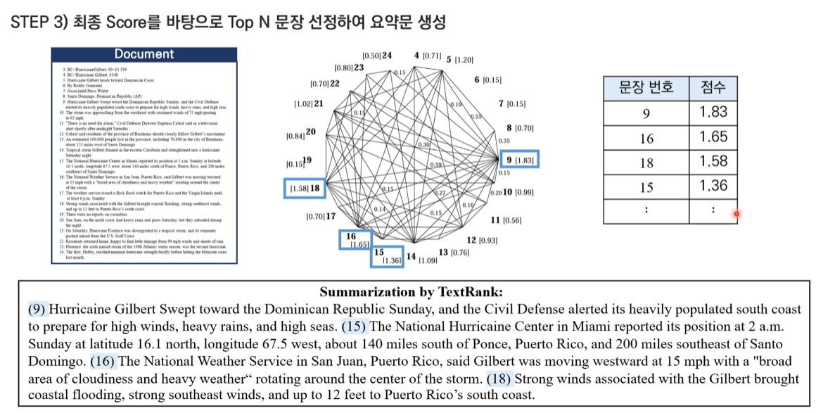 TextRank for Sentence Extraction에 대해 주어진 예시 문장들(9번, 18번)을 통해 자세히 설명드리겠습니다.