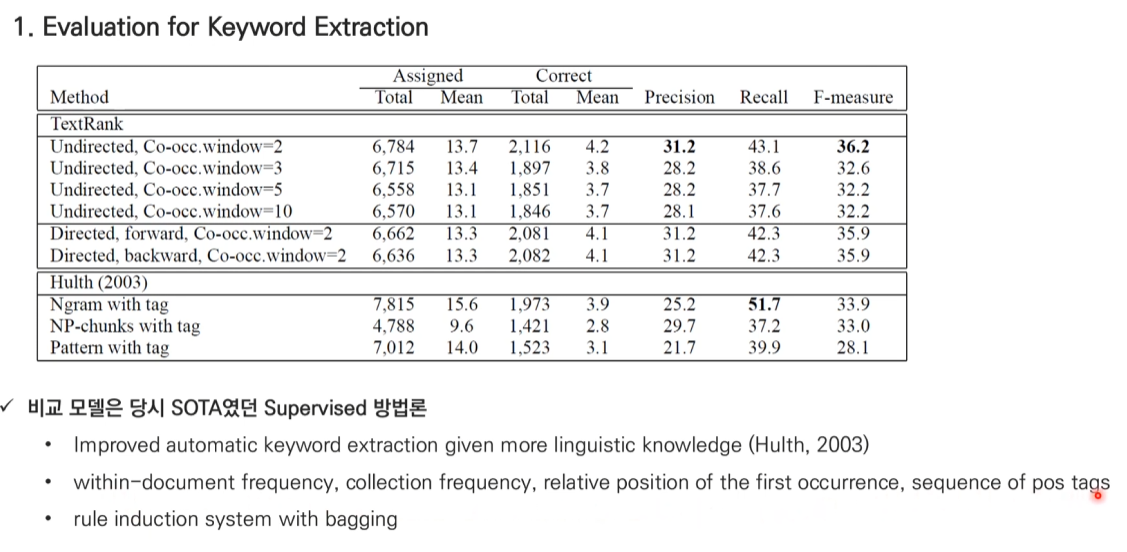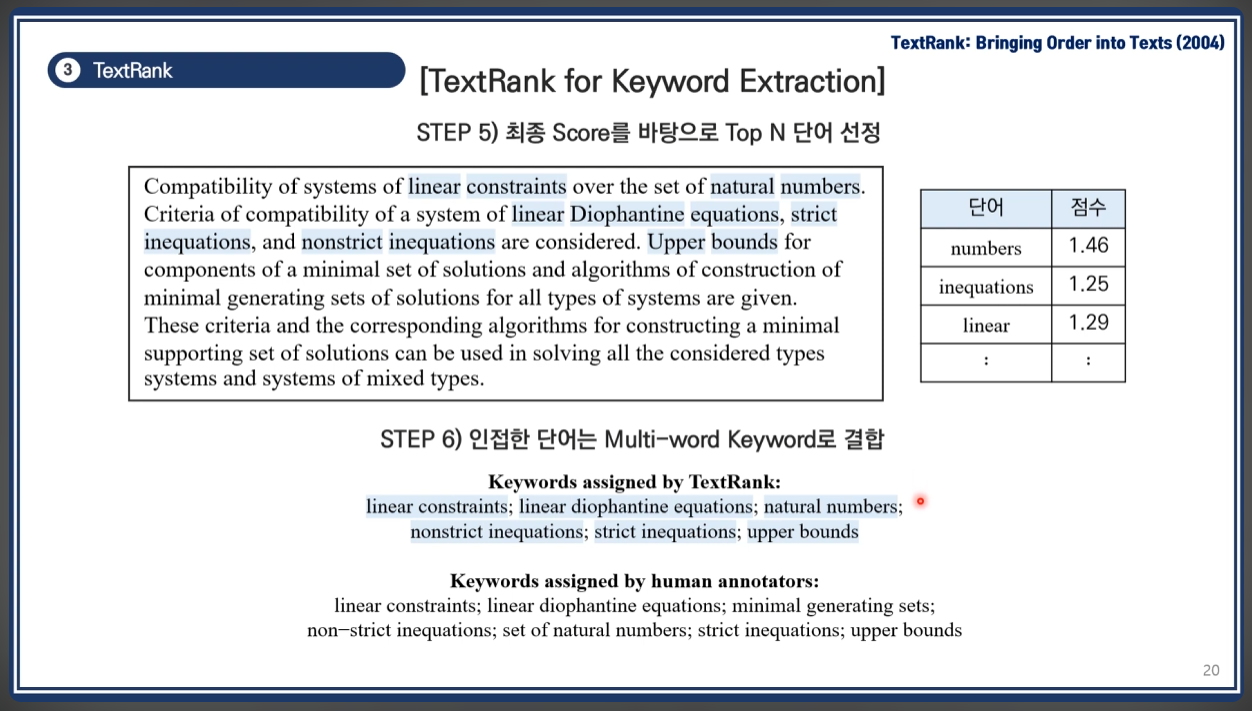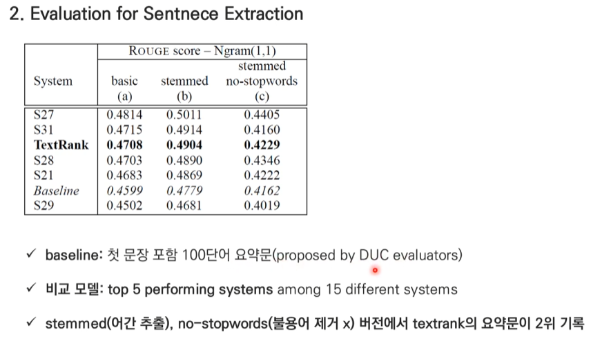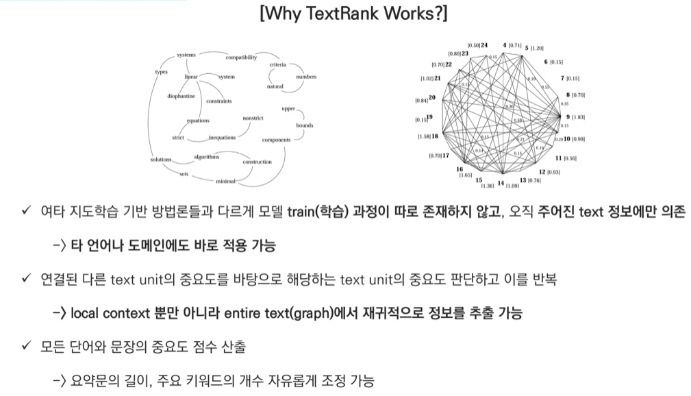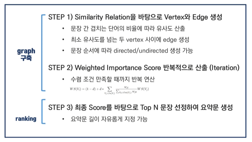 이처럼 TextRank는 문장 간의 유사도를 바탕으로 중요한 문장들을 효과적으로 추출하여 문서의 핵심 내용을 요약할 수 있습니다.