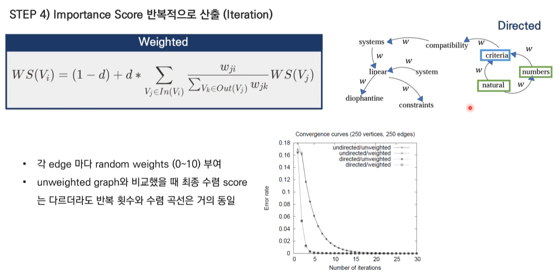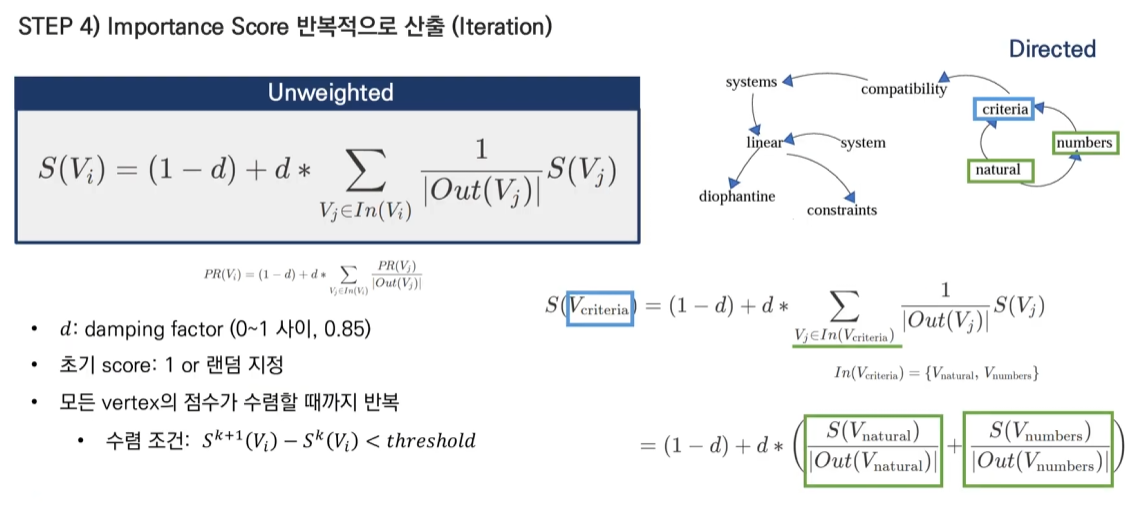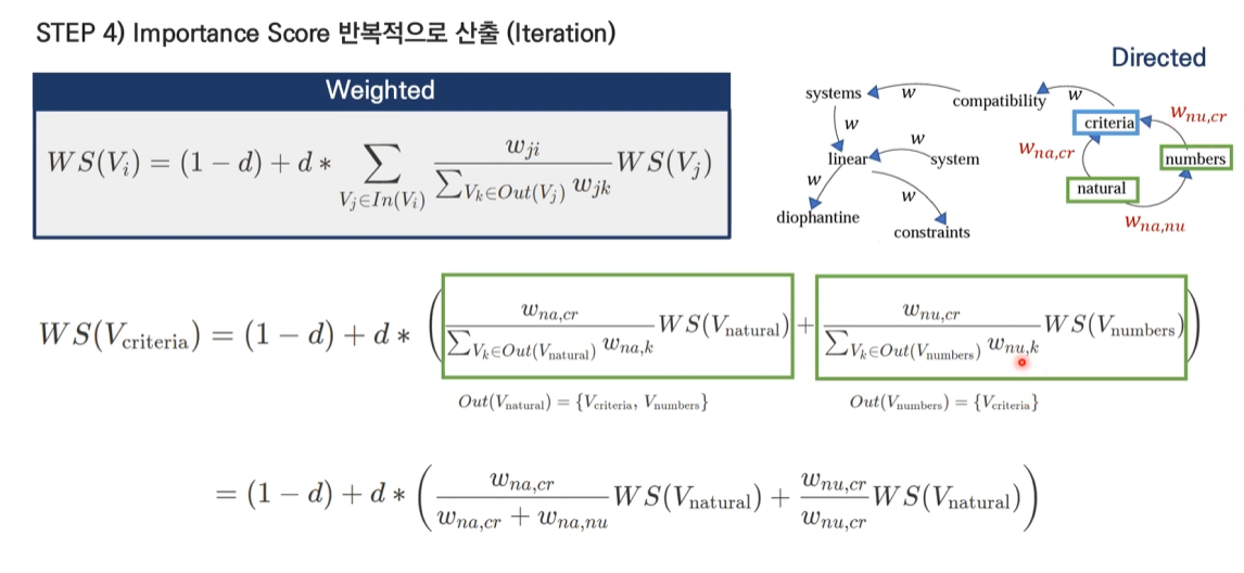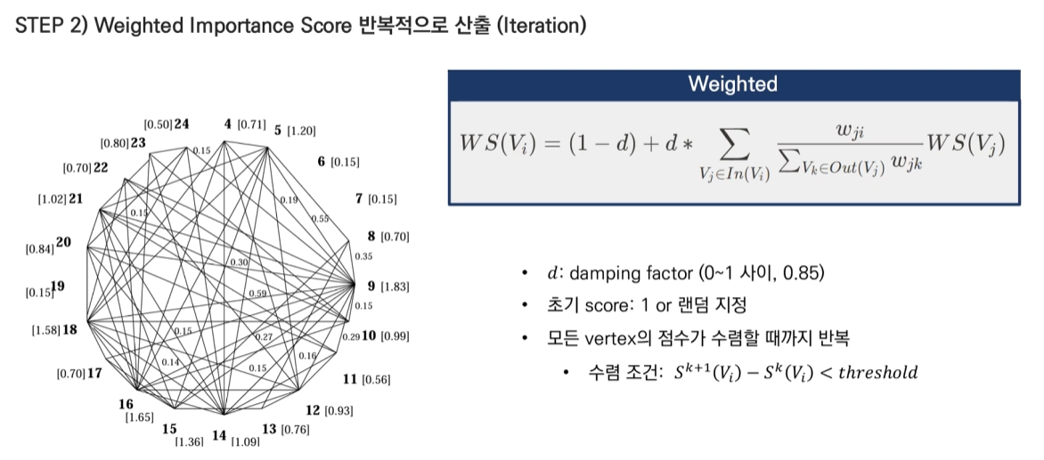 Score(Wi) = (1-d) + d * Σ(Wji * Score(Wj) / Σ(Wjk))