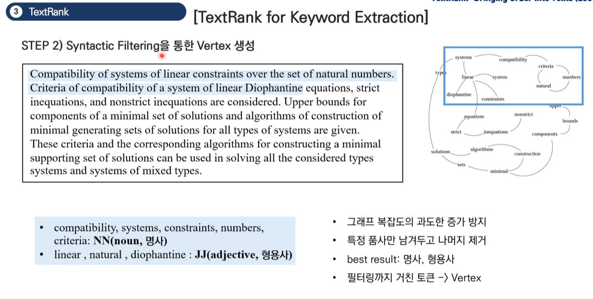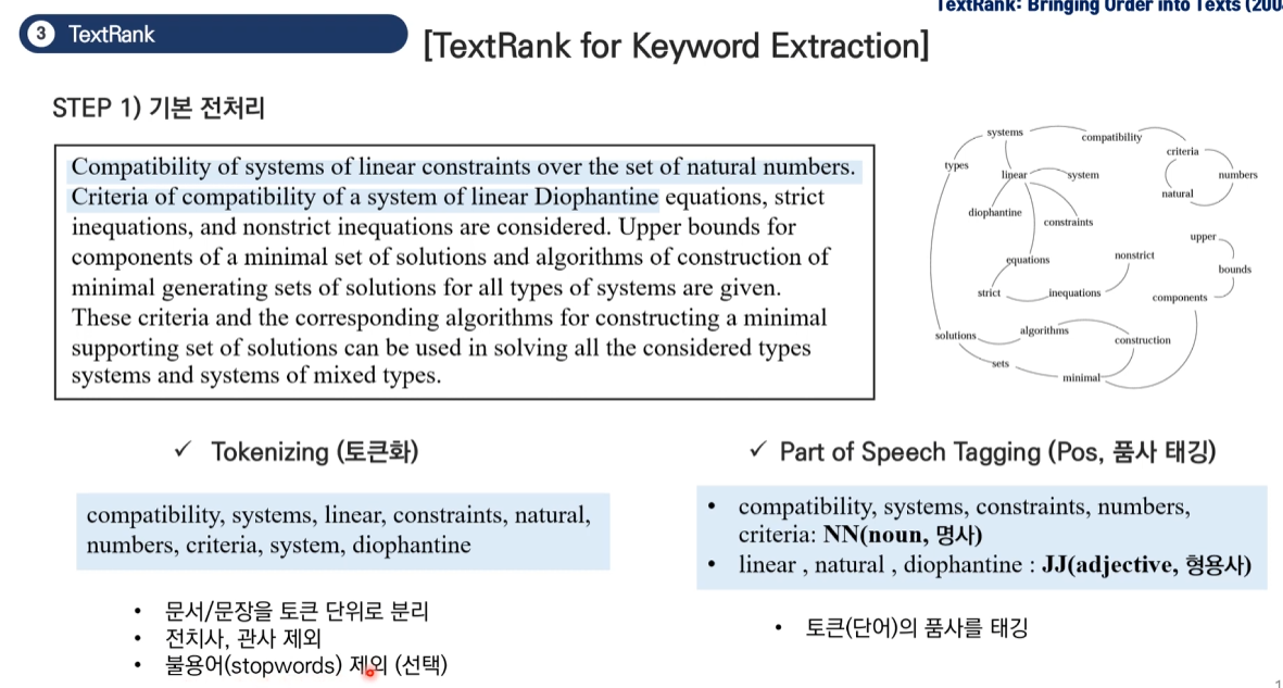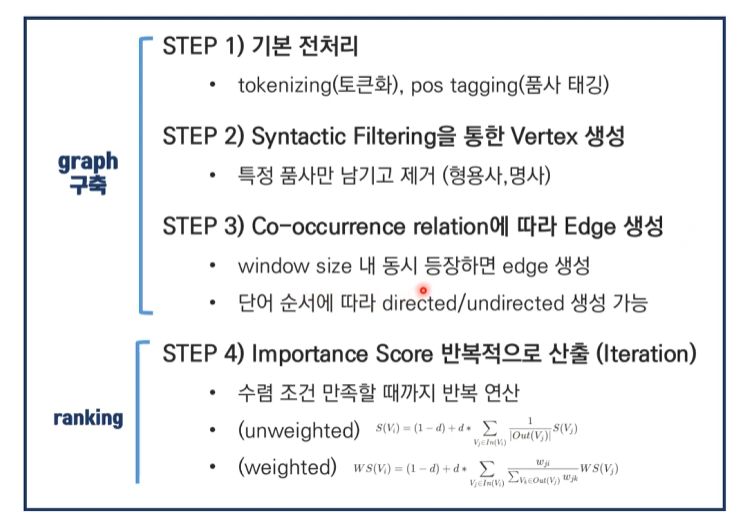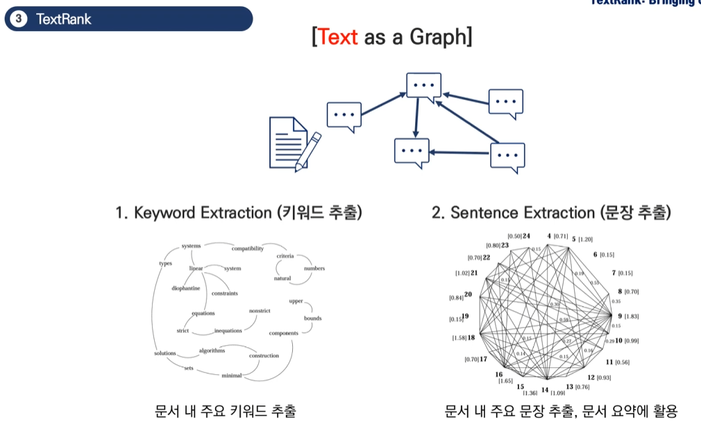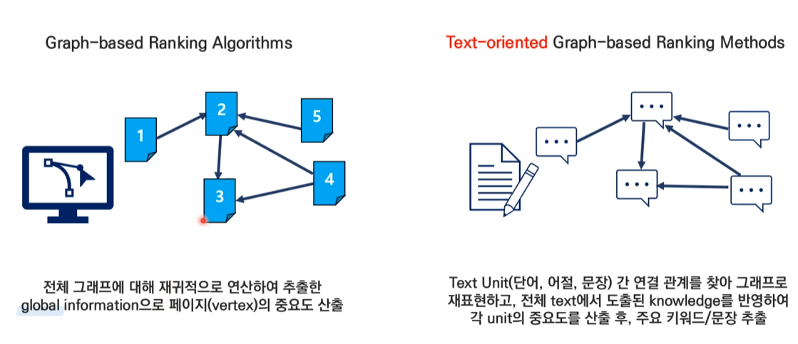 TextRank는 PageRank 알고리즘을 자연어 처리에 적용한 것으로, 크게 두 가지 주요 방법이 있습니다.