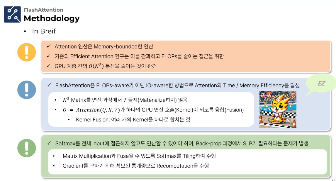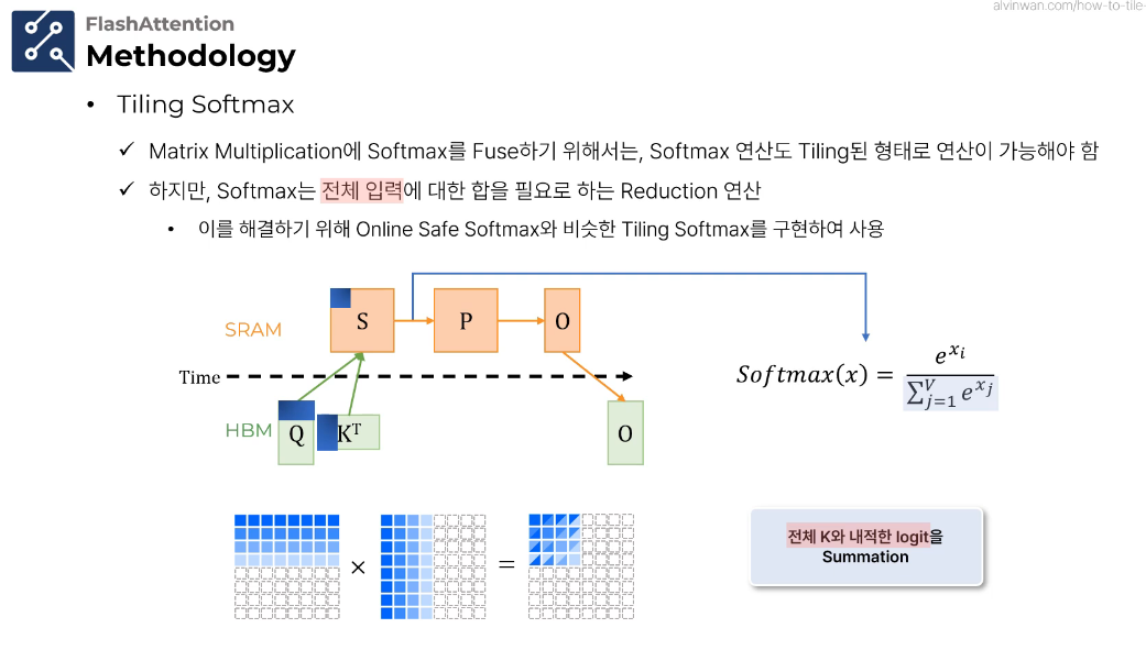 이처럼 Online Safe Softmax는 Safe Softmax의 수학적 변형이며, 계산 과정만 다를 뿐 최종적으로 동일한 결과를 산출합니다. 이는 수치적 안정성을 유지하면서도 효율적인 순차 처리를 가능하게 합니다.