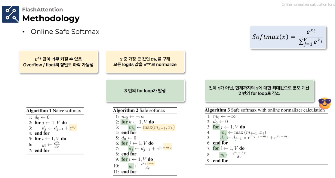 이런 방식으로 Online Safe Softmax는 수치적 안정성을 유지하면서도 효율적인 순차 처리가 가능합니다.