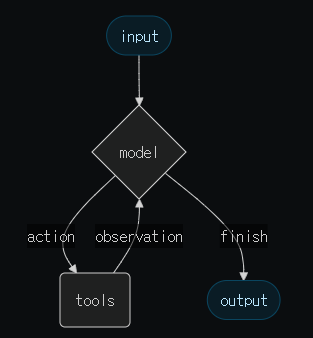 input (입력)input으로 들어옵니다.model (모델 / 두뇌)input을 받은 **LLM(두뇌)**입니다. 이곳은 Agent의 중앙 결정 센터입니다. 다이아몬드 모양인 이유는 '결정' 또는 '분기'가 일어나는 지점이기 때문입니다.input, 나중에는 observation)를 바탕으로 다음 중 하나를 결정합니다.input을 봅니다: "서울 날씨와 LangChain 검색, 두 가지가 필요하군. 일단 날씨부터!"action 경로로 분기합니다.action (행동)model이 "도구를 써야겠다!"라고 결정했을 때, 어떤 도구를 어떻게 호출할지에 대한 구체적인 '명령'입니다.model이 get_weather 도구가 필요하다고 판단했습니다.action 내용: "get_weather 함수를 location='서울' 매개변수와 함께 실행하라."tools (도구)action에서 내려온 명령을 실제로 실행하는 노드입니다. get_weather나 search_google 같은 실제 파이썬 함수들이 대기하고 있는 곳입니다.get_weather(location="서울") 함수가 실제로 호출됩니다.observation (관찰)tools 노드에서 실행된 결과값입니다. Agent 입장에서는 도구를 사용해 '관찰'한 사실입니다.observation 내용: "서울의 날씨는 맑고 25도입니다."observation → model (피드백)설명: 이것이 바로 '순환 고리(loop)'의 핵심입니다. 도구 사용 결과(Observation)가 다시 model에게 전달됩니다.