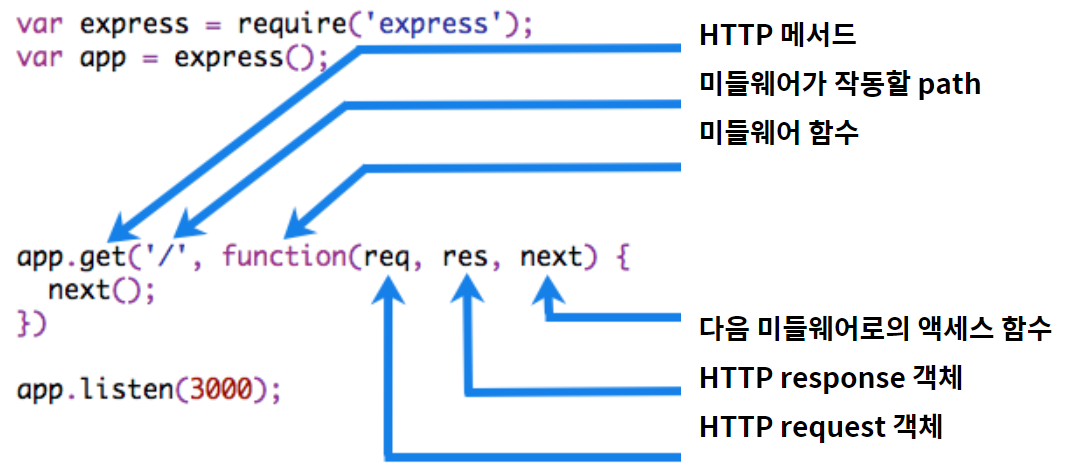 💡 미들웨어 함수는 req(요청) 객체, res(응답) 객체, 그리고 어플리케이션 요청-응답 사이클 도중 그 다음의 미들웨어 함수에 대한 엑세스 권한을 갖는 함수이다.