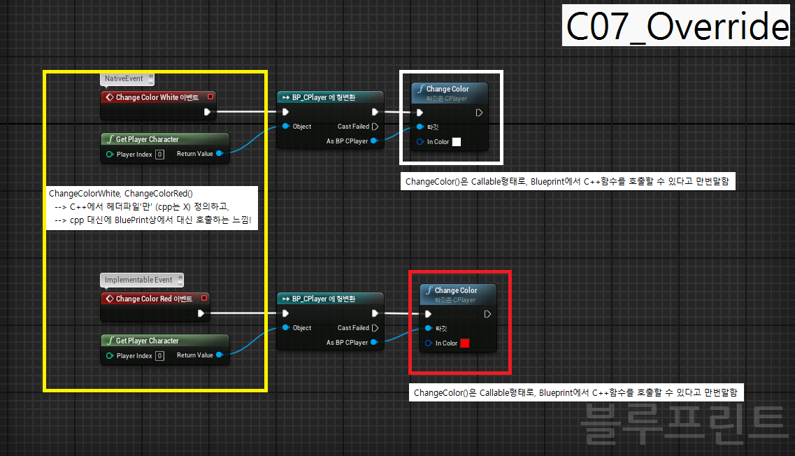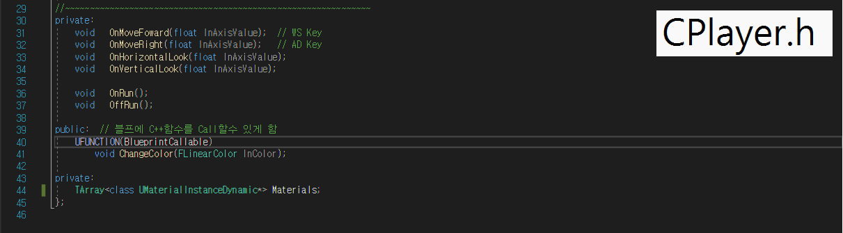 Blueprint에 C++함수를 Call할 수 있는 BlueprintCallable형태로 ChangeColor 함수를 호출함..