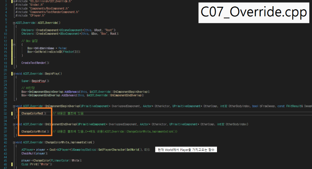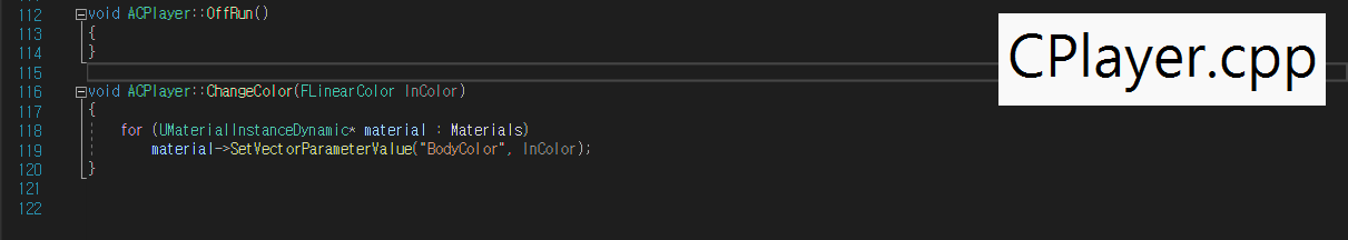 그리고, cpp파일에 ChangeColor을 정의하고,,