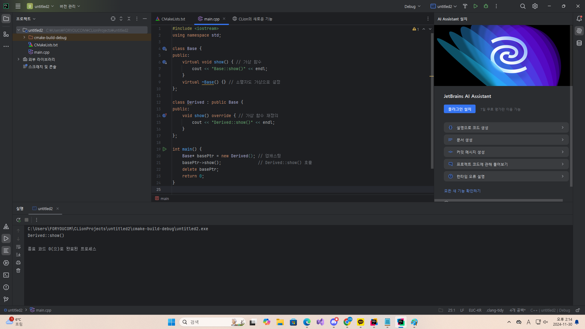 VTABLE을 통해 Derived::show()의 함수 포인터를 찾아 호출