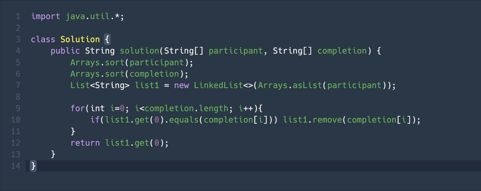 import java.util.*; class Solution { public String solution(String[] participant, String[] completion) { List<String> list1 = new ArrayList<>(Arrays.asList(participant)); for(int i=0; i<completion.length; i++){ if(list1.contains(completion[i])) list1.remove(completion[i]); } return list1.get(0); } }