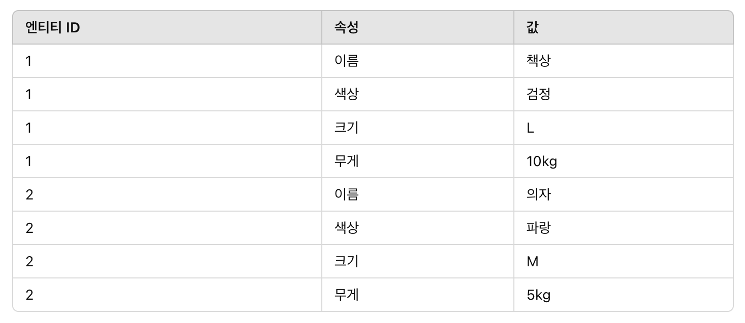 일반적인 데이터 모델과 다르게, EAV 모델은 데이터를 조회하거나 정렬, 필터할 때마다 수많은 Join 연산이 발생하고, Index를 적용하기도 어려우므로 매번 Full Scan을 사용하여 성능이 좋지 않습니다.