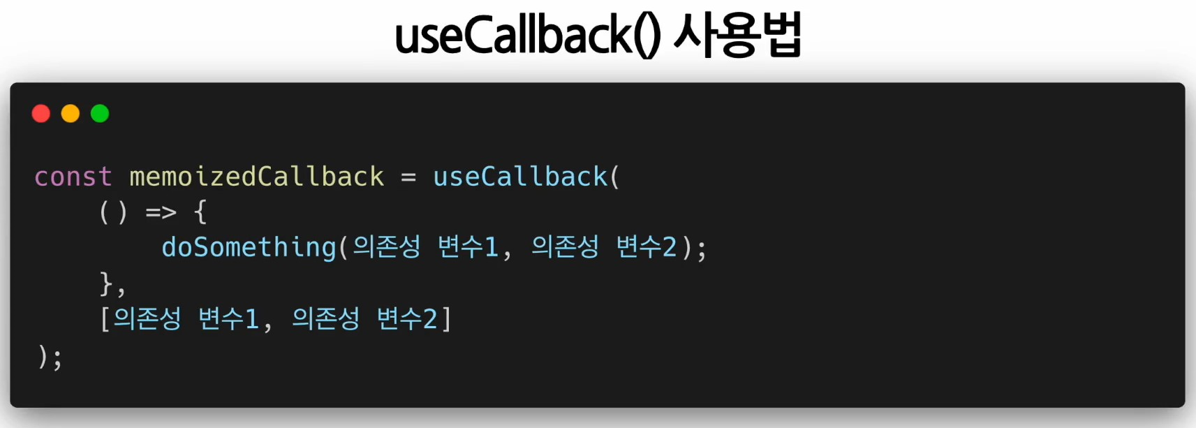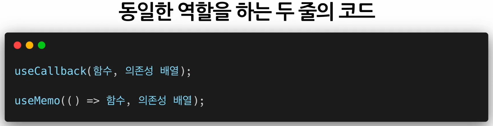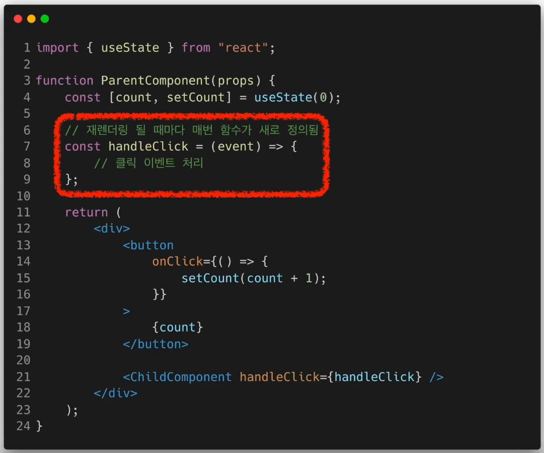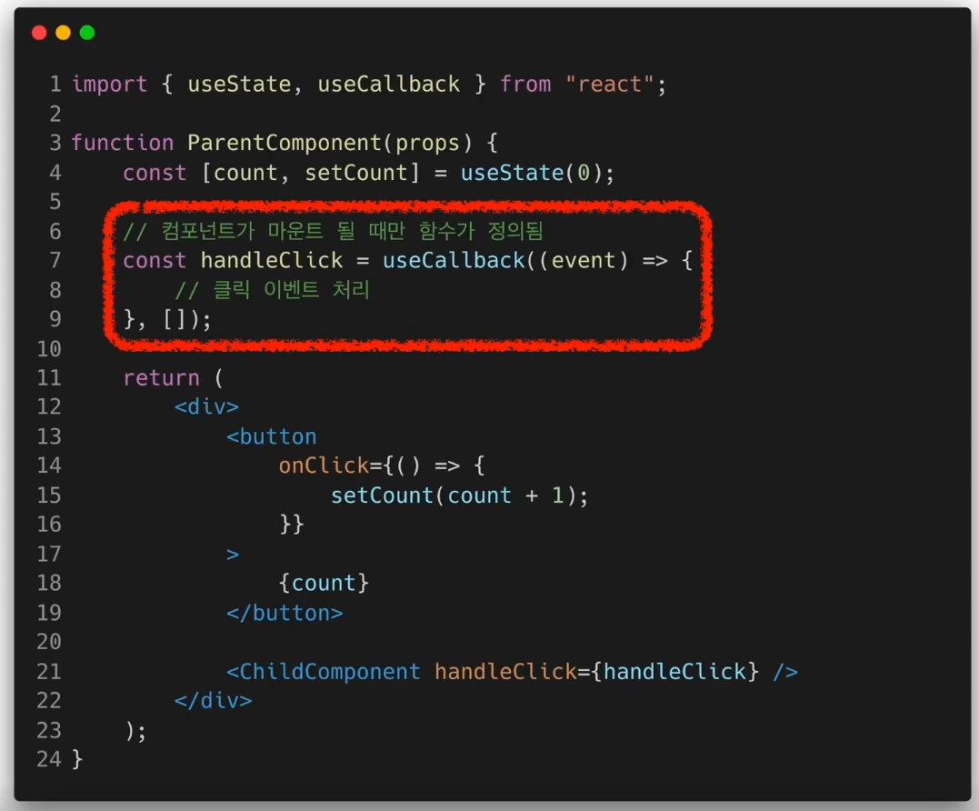 - 컴포넌트가 렌더링 될 때마다 함수를 새로 정의하는 것이 아니라 의존성 배열의 값이 바뀐 경우에만 함수를 새로 정의해서 return