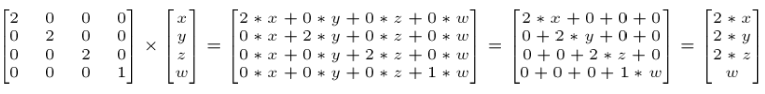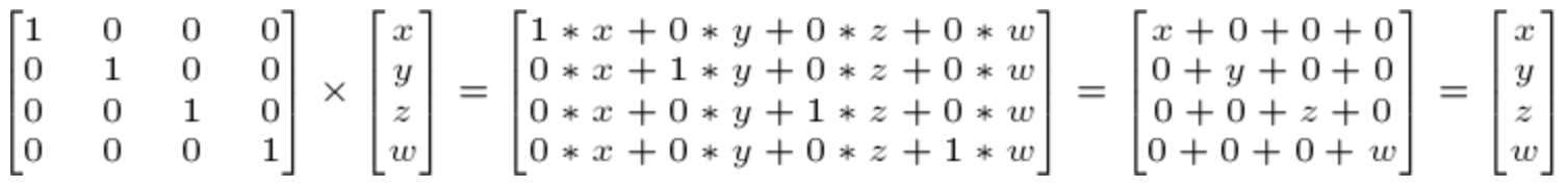 벡터(x,y,z,w)를 매트릭스와 곱해도 여전히 (x,y,z,w)이므로 위 행렬은 단위행렬임.
