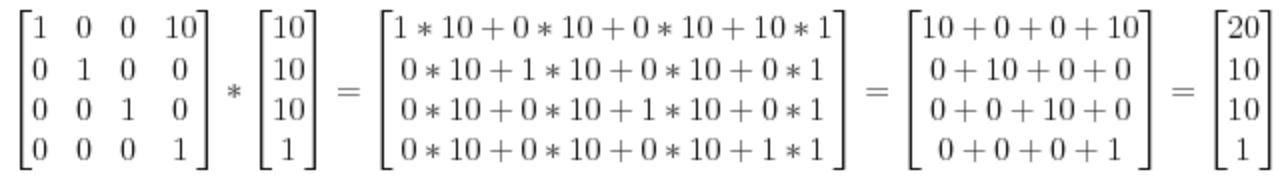 위 행렬의 X, Y, Z 값에 값을 입력하면 해당 값 만큼 X, Y, Z 축으로 이동 시킬 수 있다. 위 예시의 경우 정점(10, 10, 10) 을 X 방향으로 10만큼 이동시킨 결과.