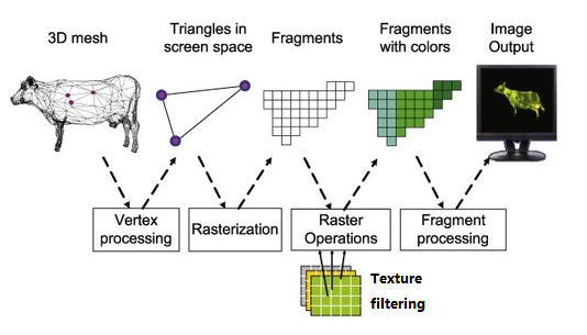 데이터가 정점에서부터 시작되어 면이 되고 색상이 입혀져 화면에 그려지기 까지의 처리과정.