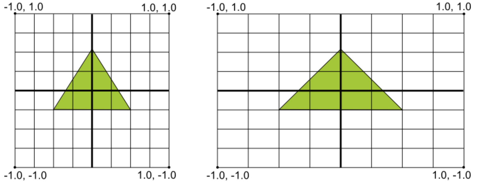 OpenGL의 기본적인 좌표계를 가로가 넓은 안드로이드 스크린 비율에 매핑시 오른쪽 처럼 왜곡이 발생함. MVP 매트릭스로 이 왜곡을 교정 할 수 있다.