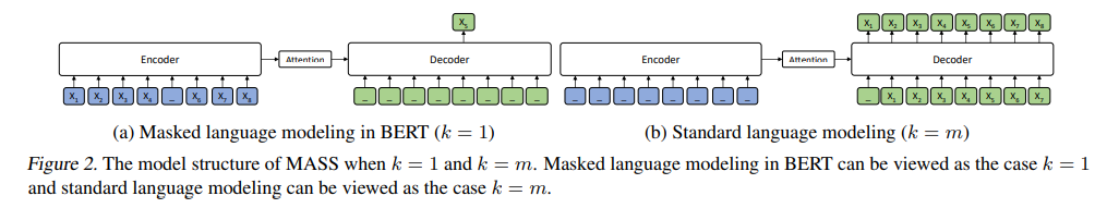 MASS는 MASK가 씌워진 sentence 전체를 input으로 입력받고, seq2seq 모델을 pre-training 할 때 문장에서 마스킹된 부분인 부터 까지의 tokens을 예측한다.