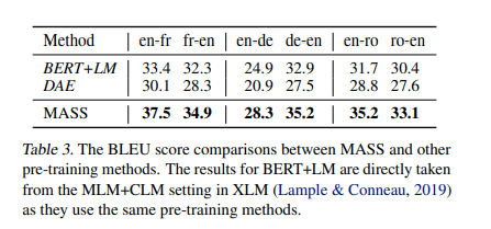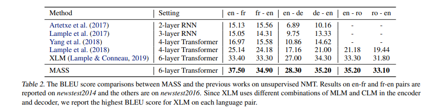 특히, 영어-프랑스어 비지도 번역에서 SOTA를 달성했다. (BLEU score 37.5)