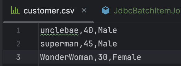 customer_new_v1.csv 파일을 보면 Customer 테이블의 데이터가 저장되어있고 위 QueryProvider에서 설정한 조건(age >= 20, id 필드기준으로 내림차순 정렬)이 잘 적용되어 출력된 것을 확인할 수 있다.