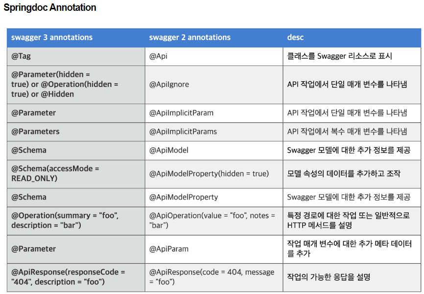 Swagger 3과 Swagger 2의 어노테이션 차이가 있어 아래 표를 첨부한다.!