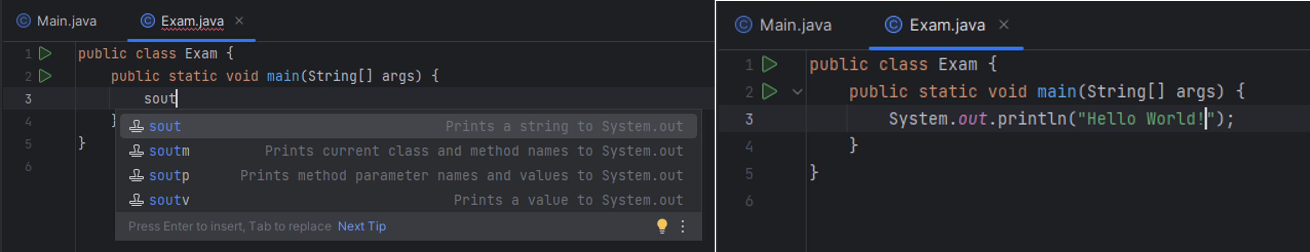 마찬가지로 Eclipse의 syso처럼, IntelliJ에서는 sout 입력 후 [tab]을 누르면 출력 함수가 자동완성된다.