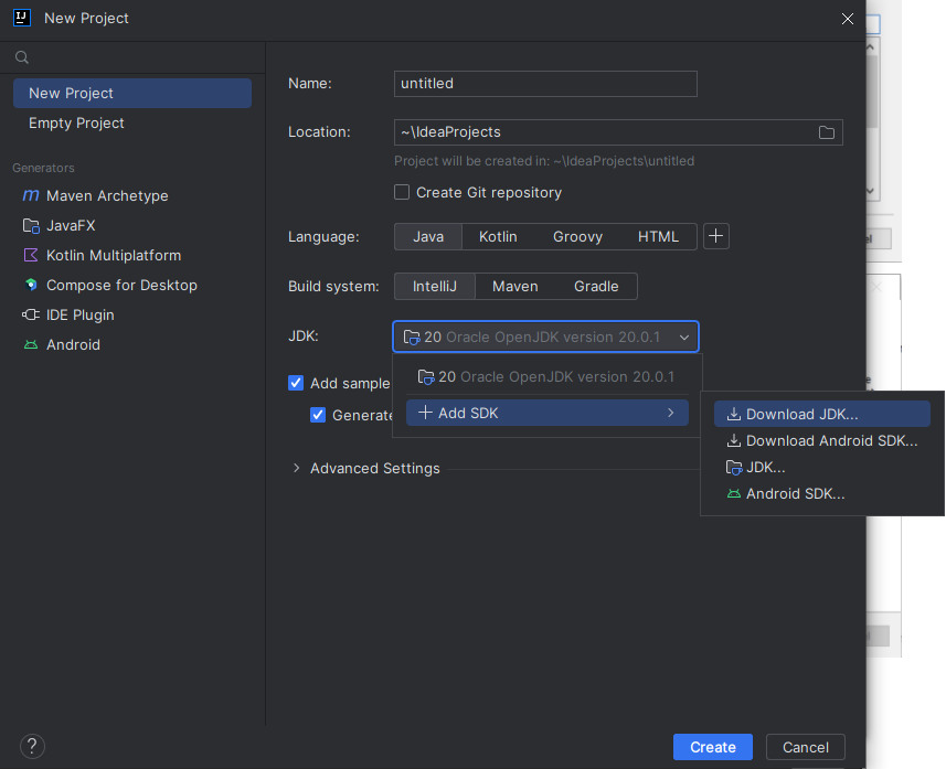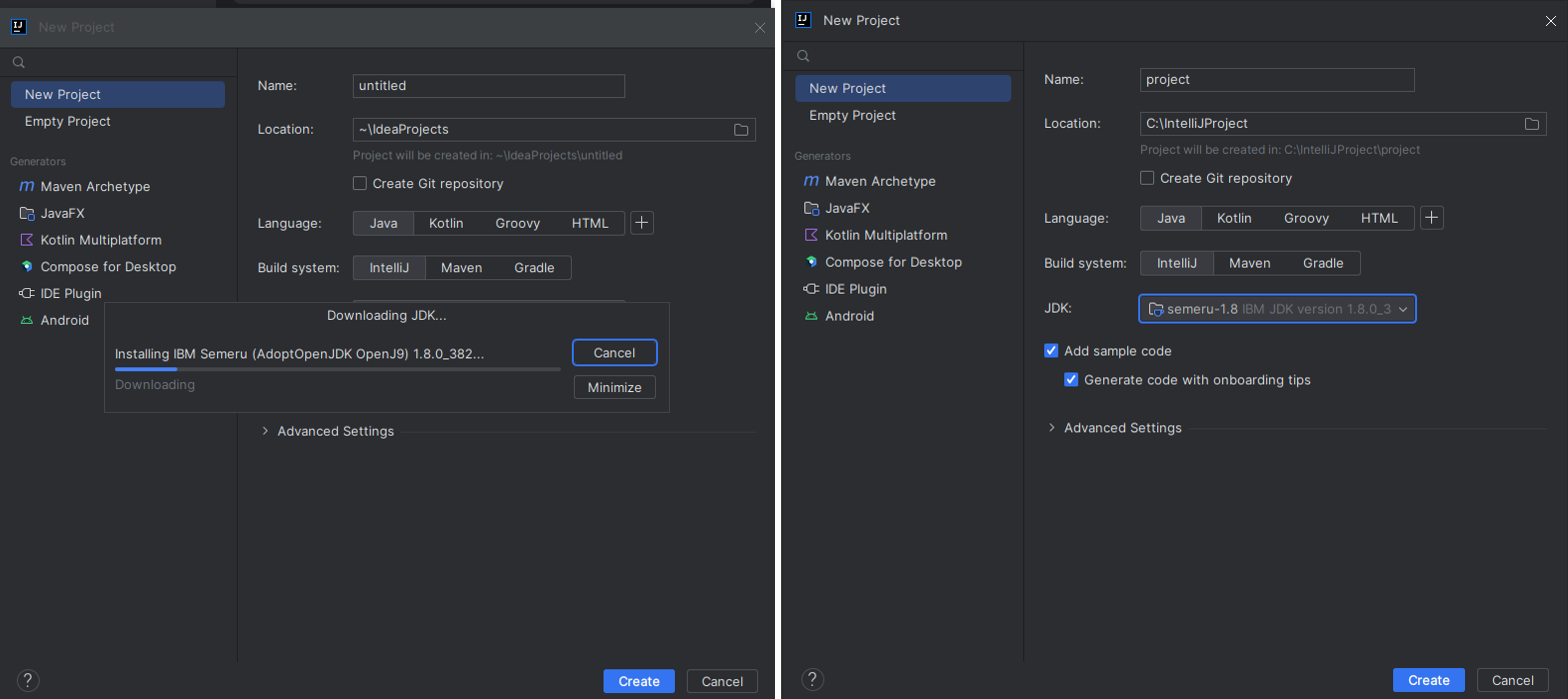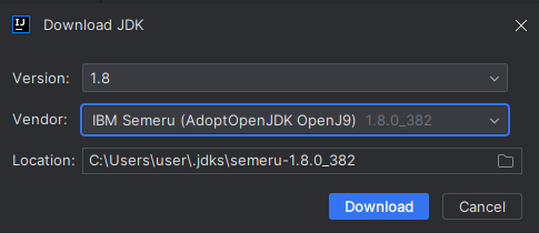8) 설치된 JDK가 없을 시 [Add SDK] > [Download JDK]를 통해 다운로드 할 수 있다.