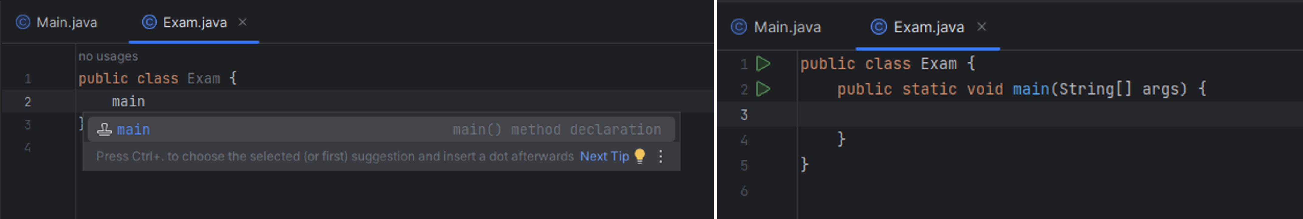 15) main 메서드는 직접 입력해도 되고, main 입력 후 [tab]을 누르면 main 메소드가 자동완성된다.