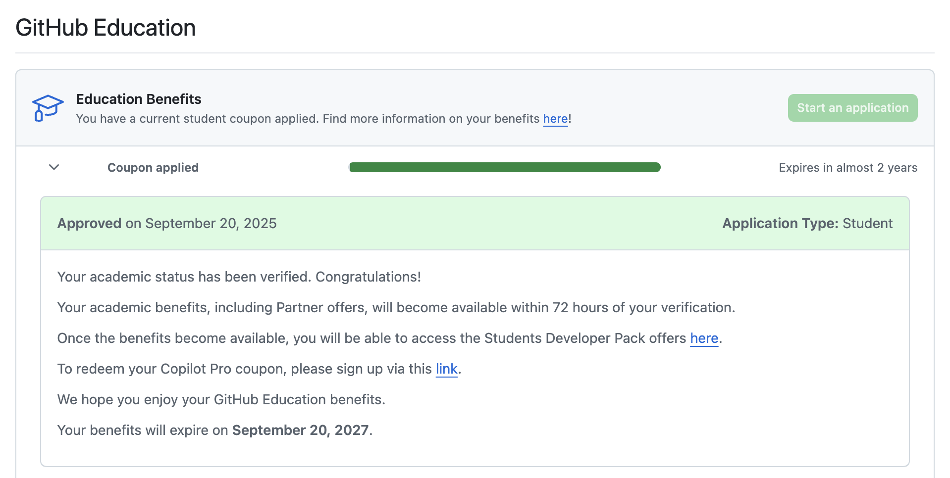 인증에 성공하면 이처럼 2년간 GitHub Education 혜택을 받을 수 있습니다.