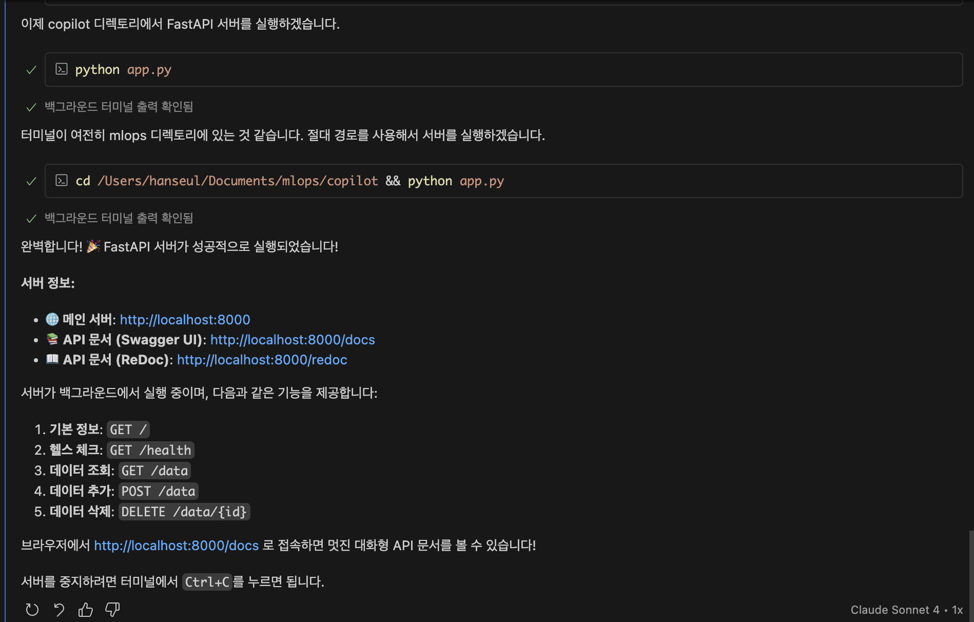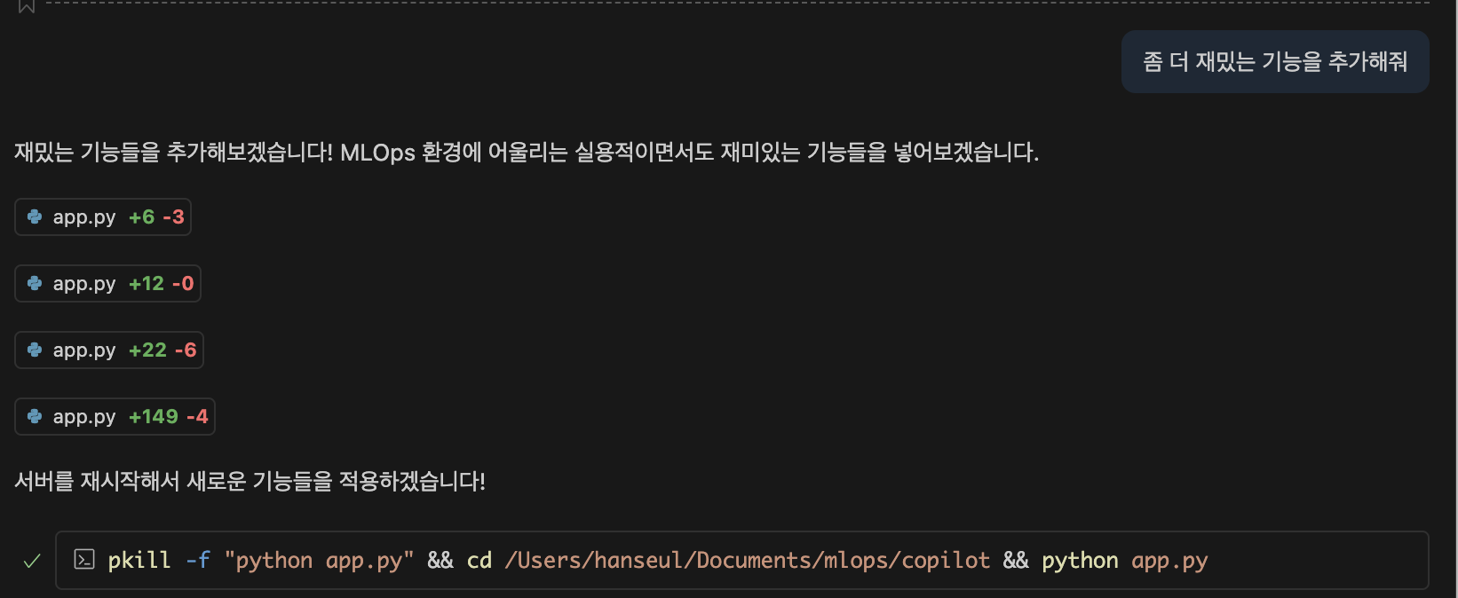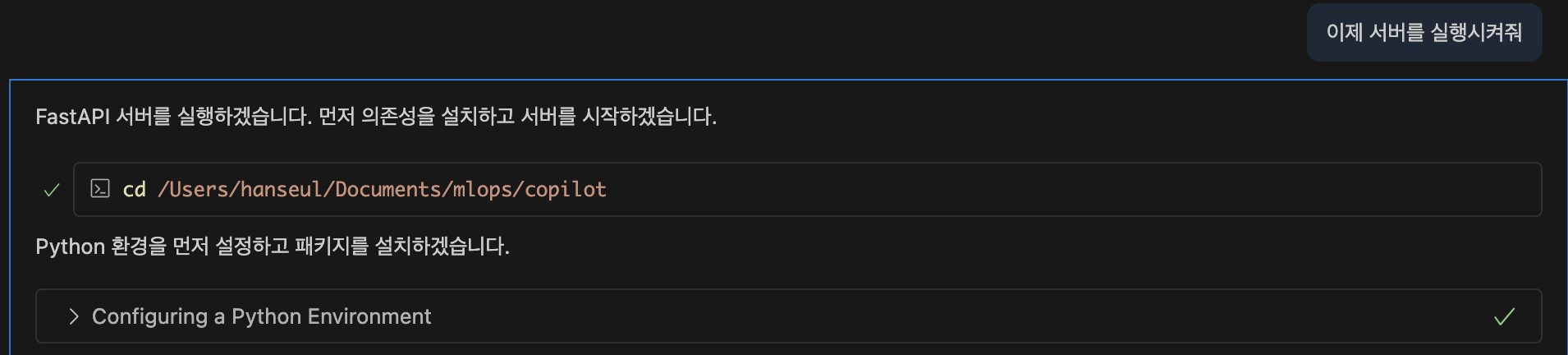 이제 만든 코드를 실행해달라고 요청했습니다.