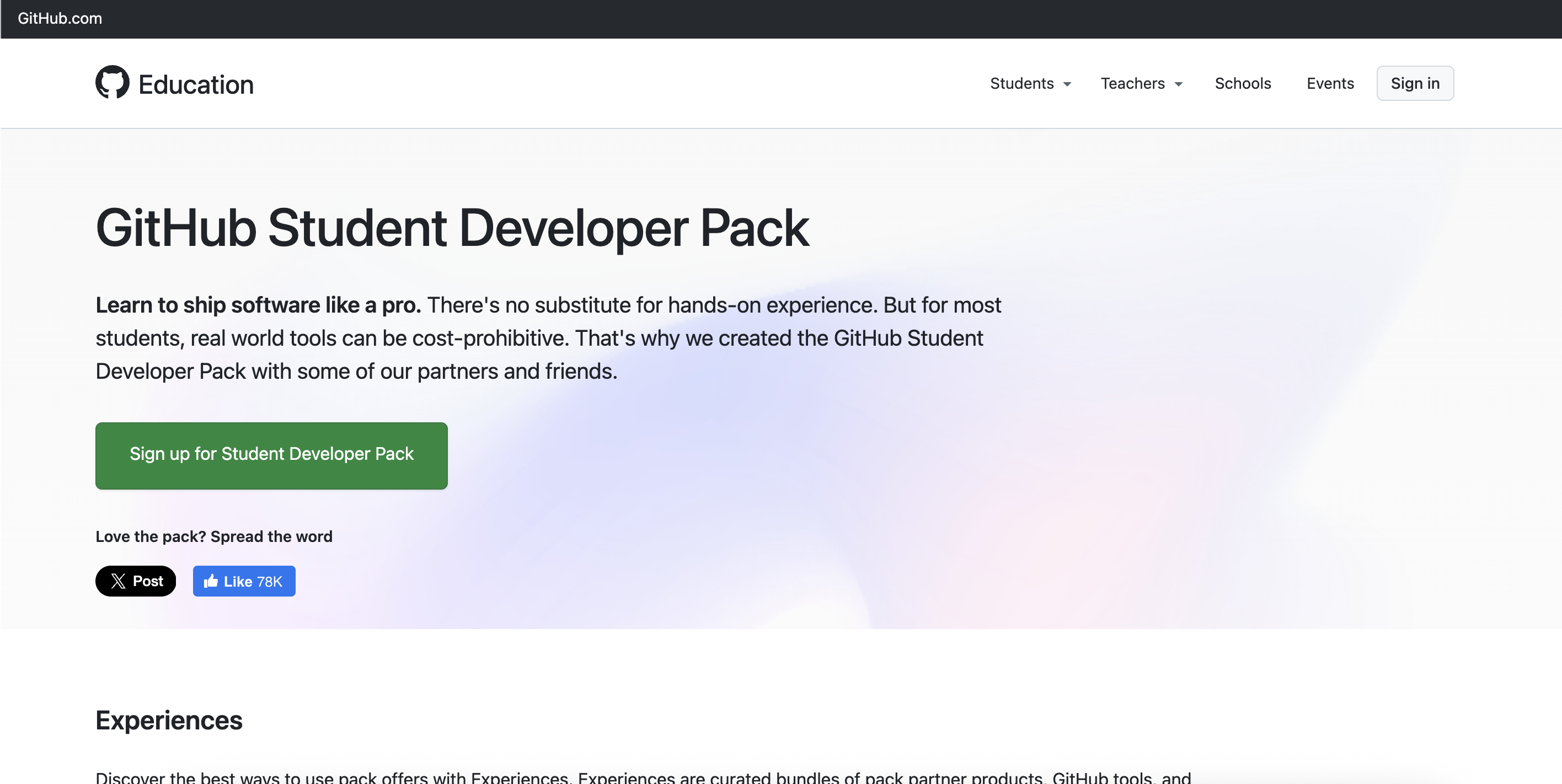 초록색의 Sign up for Student Developer Pack을 눌러 인증을 진행합니다.