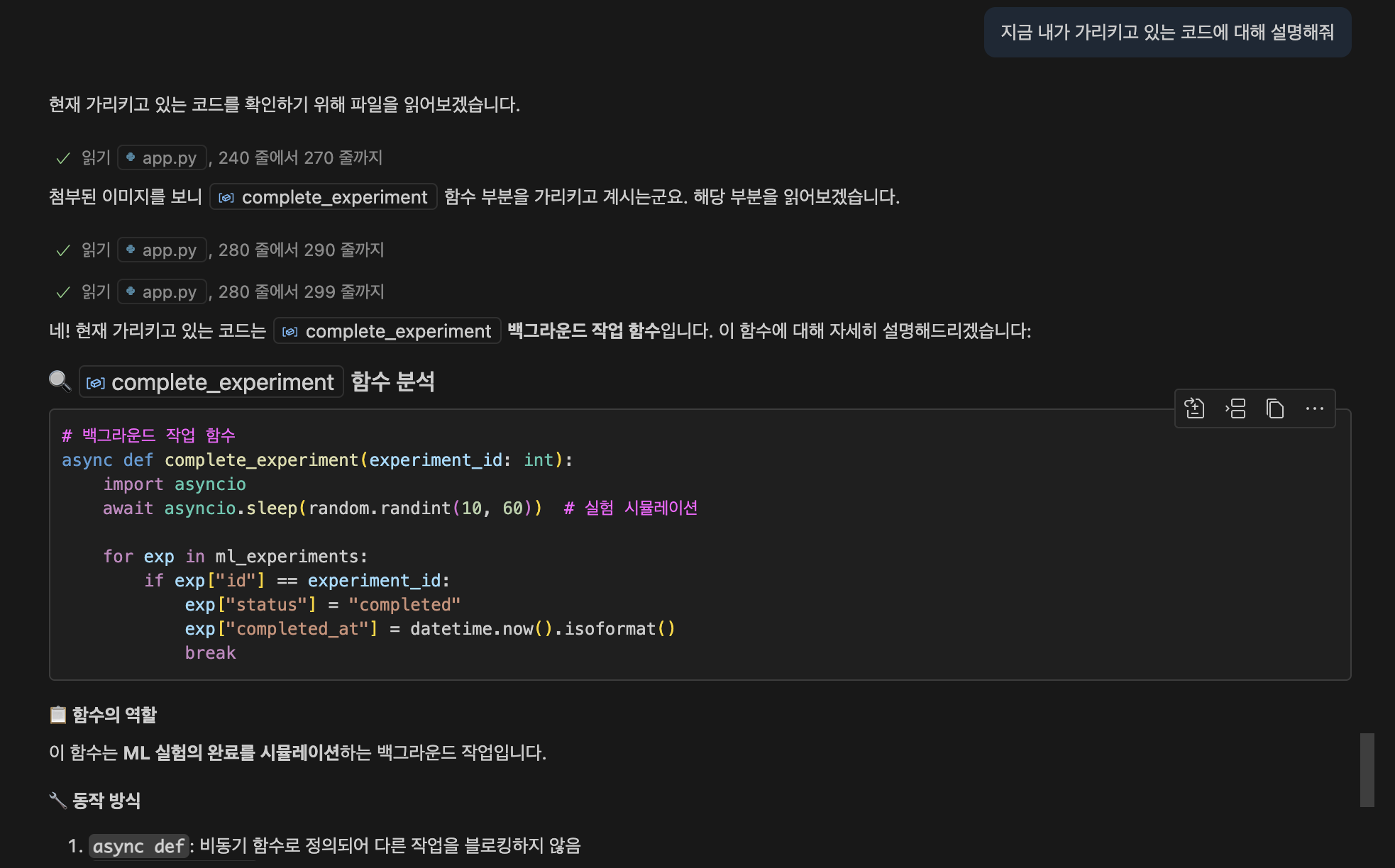 이번엔 코드 창에서 입력 커서가 있는 곳에 대해서 설명을 요청했더니 열심히 잘 설명해줍니다.