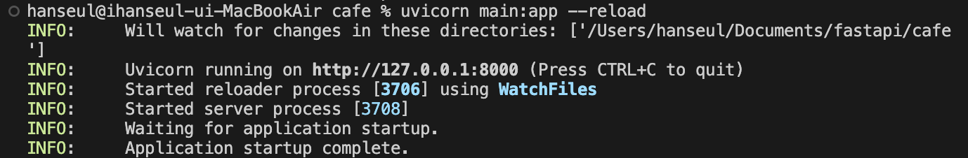 코드를 실행할 때는 uvicorn main:app --reload로 실행한다.