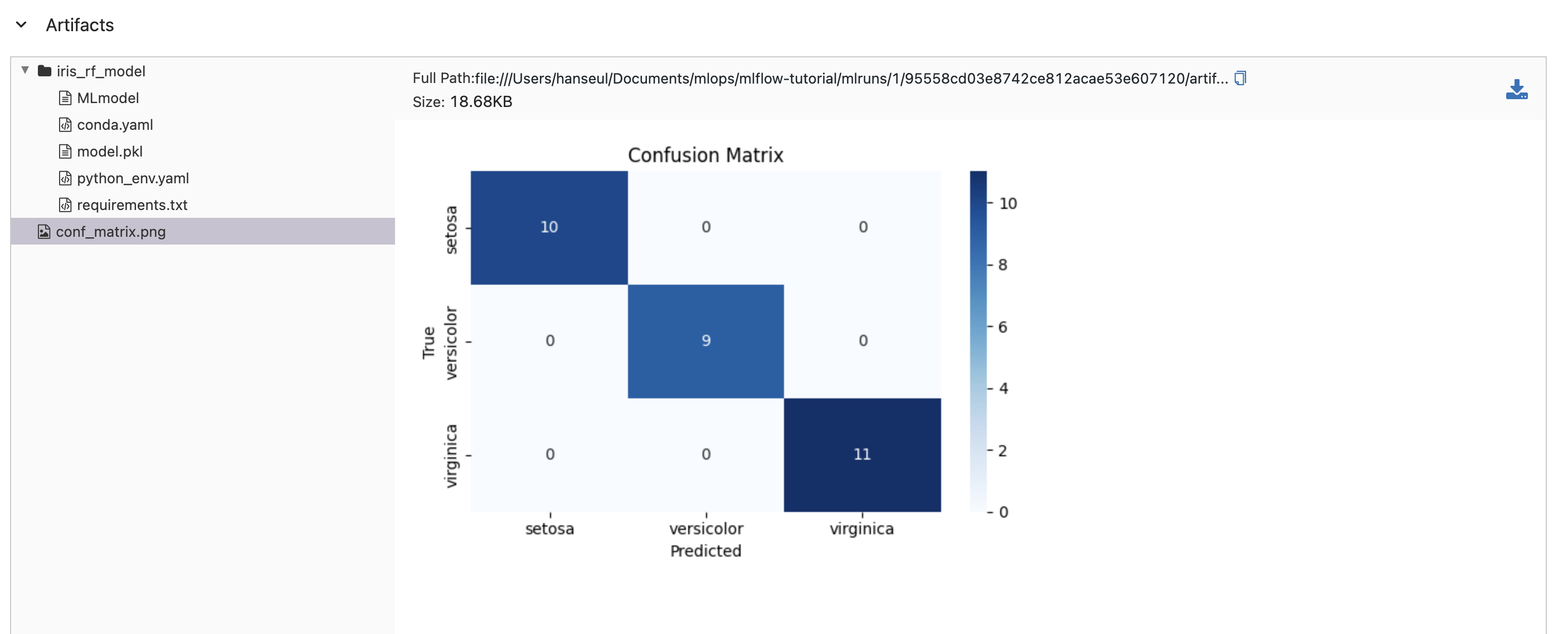 iris_rf_model은 모델의 이름으로 지정됩니다.5. 파일로 저장 후 아티팩트 로깅