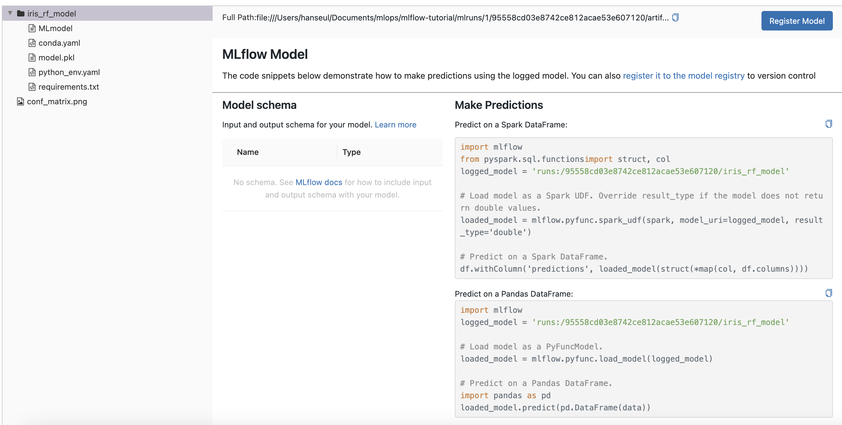 오른쪽에는 mlflow로 저장한 모델을 로드해 사용할 수 있는 예시 코드를 제공합니다.