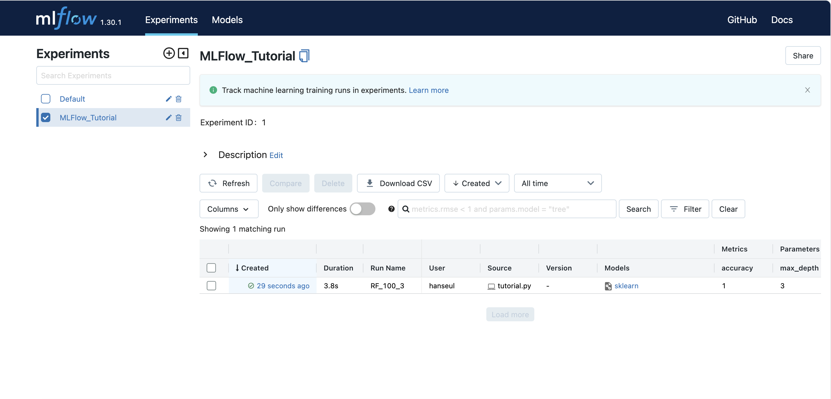 이제 tutorial.py를 실행해보면 UI에서 생성한 실험을 확인할 수 있습니다.