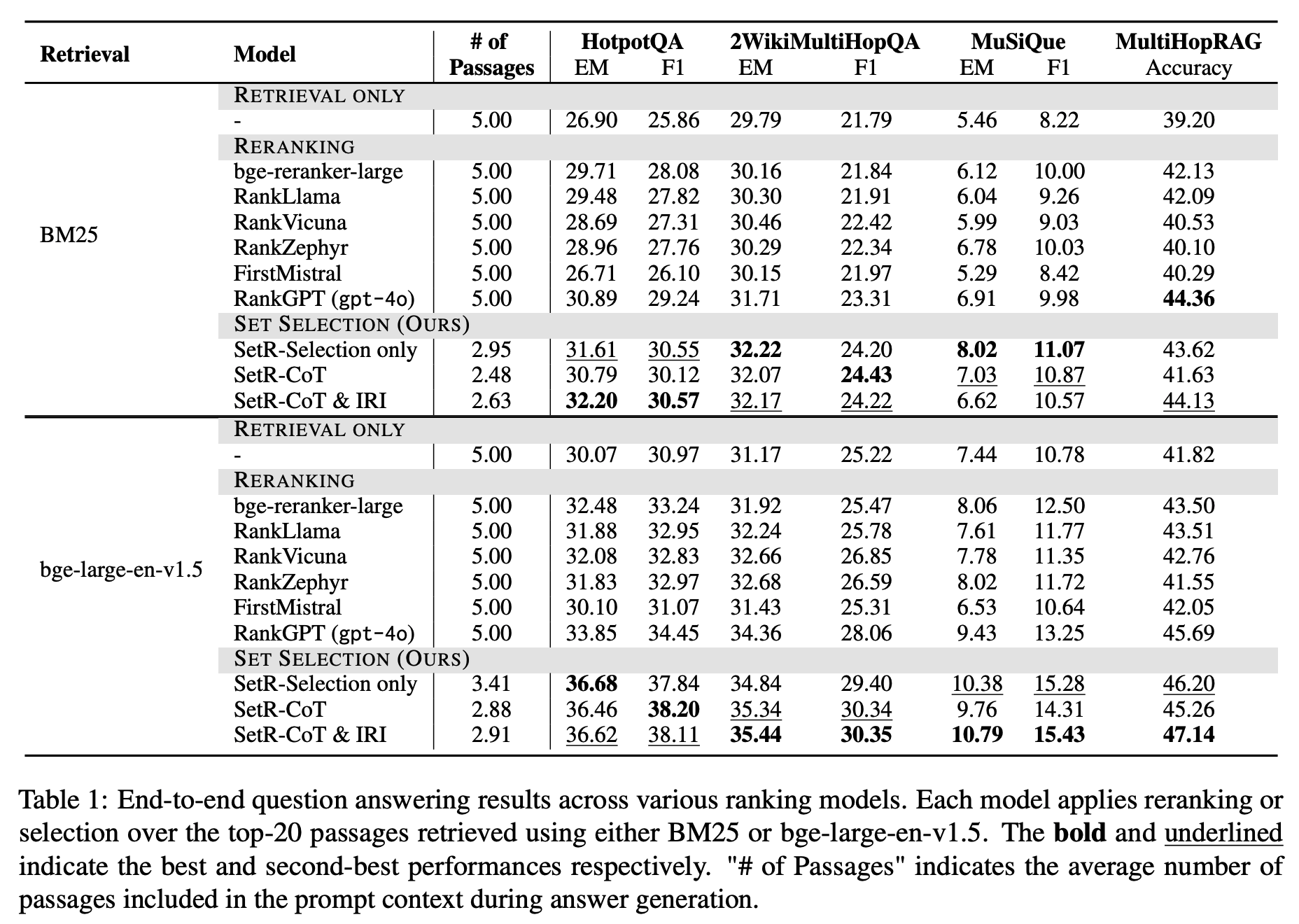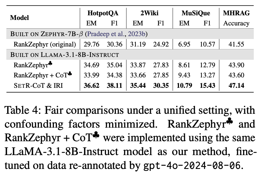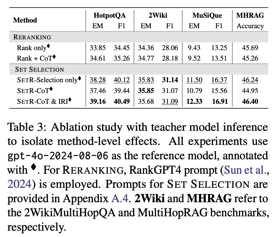 모든 모델(reranking, set selection)이 똑같이 GPT-4o teacher를 사용해 passage selection/ ranking 수행.
