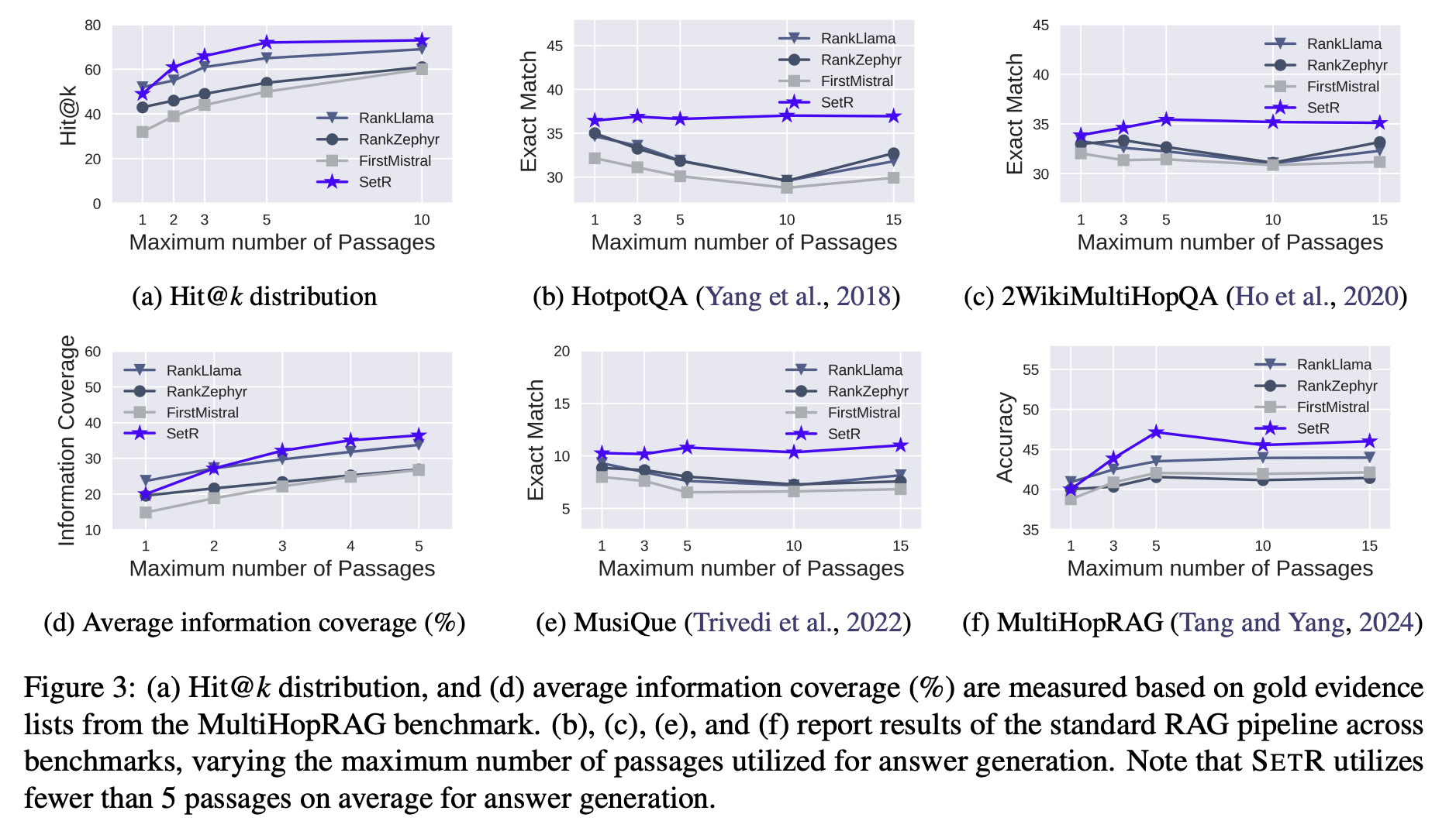 SETR는 적은 passage만 사용하면서도 consistently 높은 성능 유지.