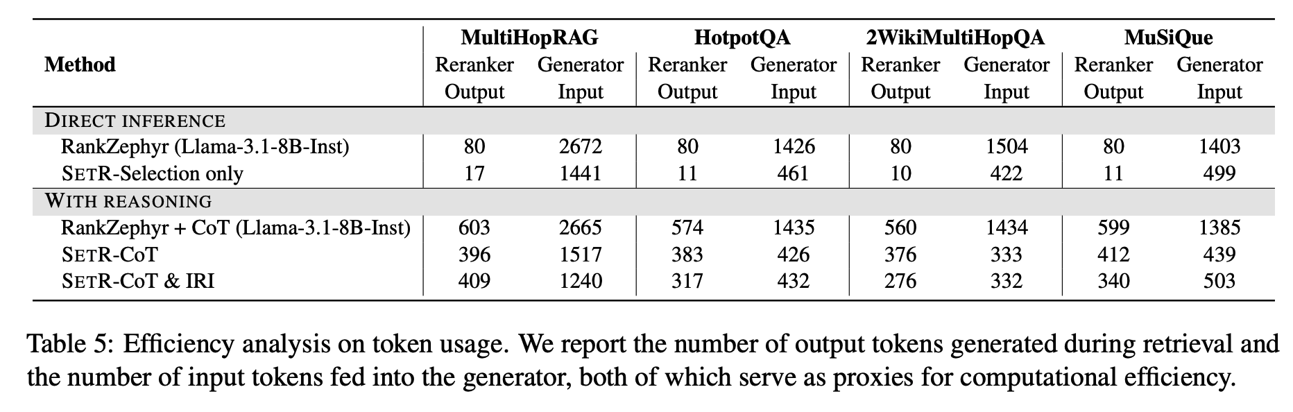 SETR는 reranking보다 훨씬 적은 입력 토큰을 사용.