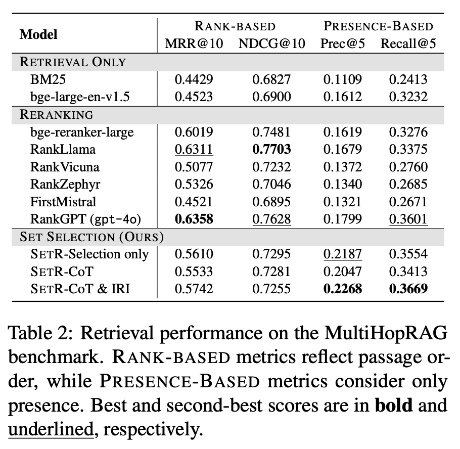 특히 IRI는 단순 CoT 대비 정확히 필요한 passage를 집합적으로 골라내는 능력이 뛰어남.