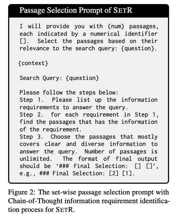 (1) SETR-Selection only: reasoning 없이 최종 passage 집합만 출력.